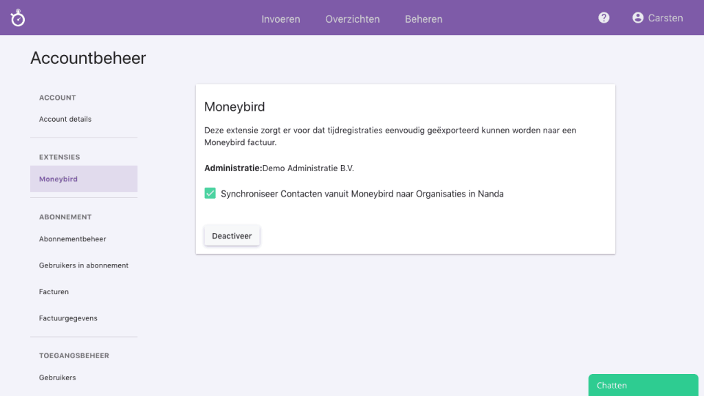 Selecteer in het menu rechtsboven ‘Accountbeheer’ en daarna ‘Moneybird’.