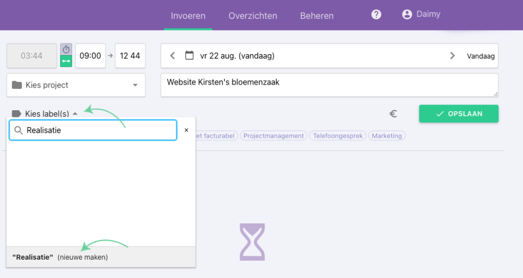 Wanneer je de naam van het label dat je wilt aanmaken invoert, staat onderaan de optie ‘nieuwe maken’. Klik je hierop, dan wordt het project automatisch aangemaakt wanneer je de tijdregistratie opslaat.
