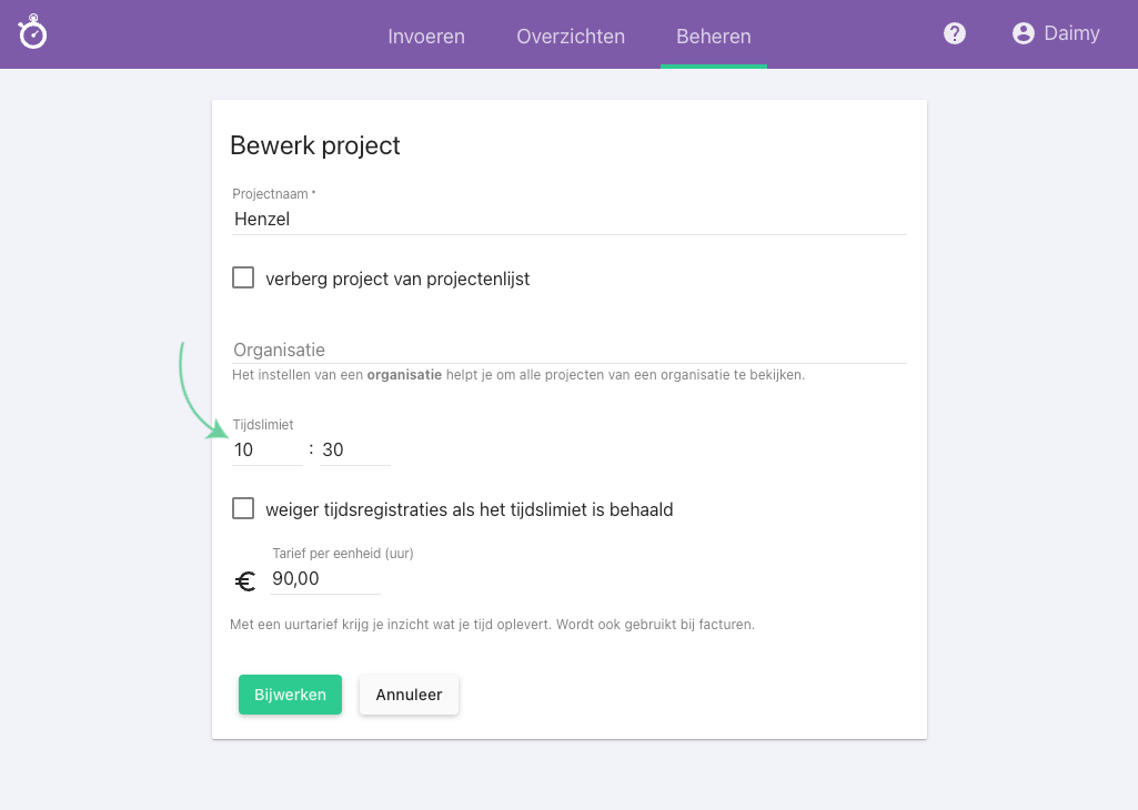 Als je hierop klikt kom je in het scherm ‘Bewerk project‘ waar je informatie kunt invoeren die betrekking hebben op een project, zoals het tijdslimiet.