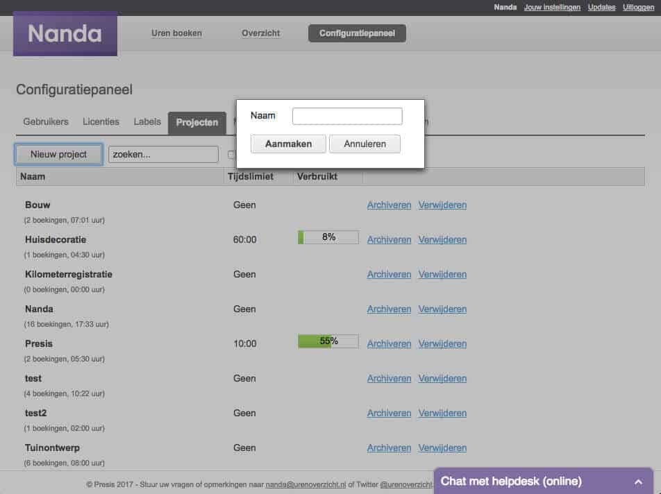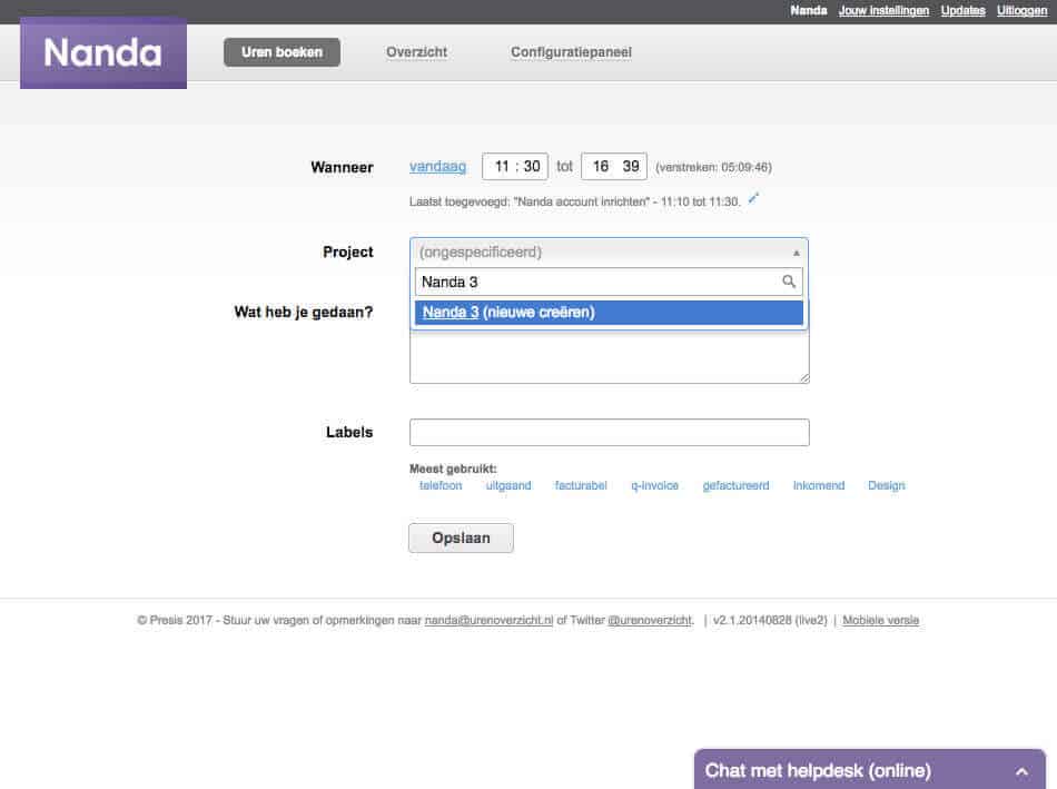 De tweede manier is door naar het scherm ‘Uren boeken’ te navigeren. Bij het veld ‘Project’ kun je kiezen uit bestaande projecten. Ben je al bezig met het invoeren van je registratie, maar heb je het juiste project nog niet aangemaakt, dan typ je de naam van het project in zoals je hem wilt hebben en druk je op de optie die je erachter ziet: ‘nieuwe creëren‘. Nanda slaat deze dan op als nieuw project.