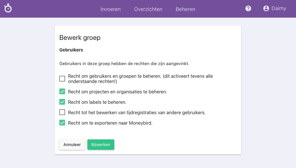 Ben je een beheerder en wil je dat de gebruikers in jouw Nanda account wel projecten en labels kunnen aanmaken, maar niet dat zij de registraties van andere gebruikers kunnen bewerken? Dan vink je dit heel gemakkelijk aan en uit.